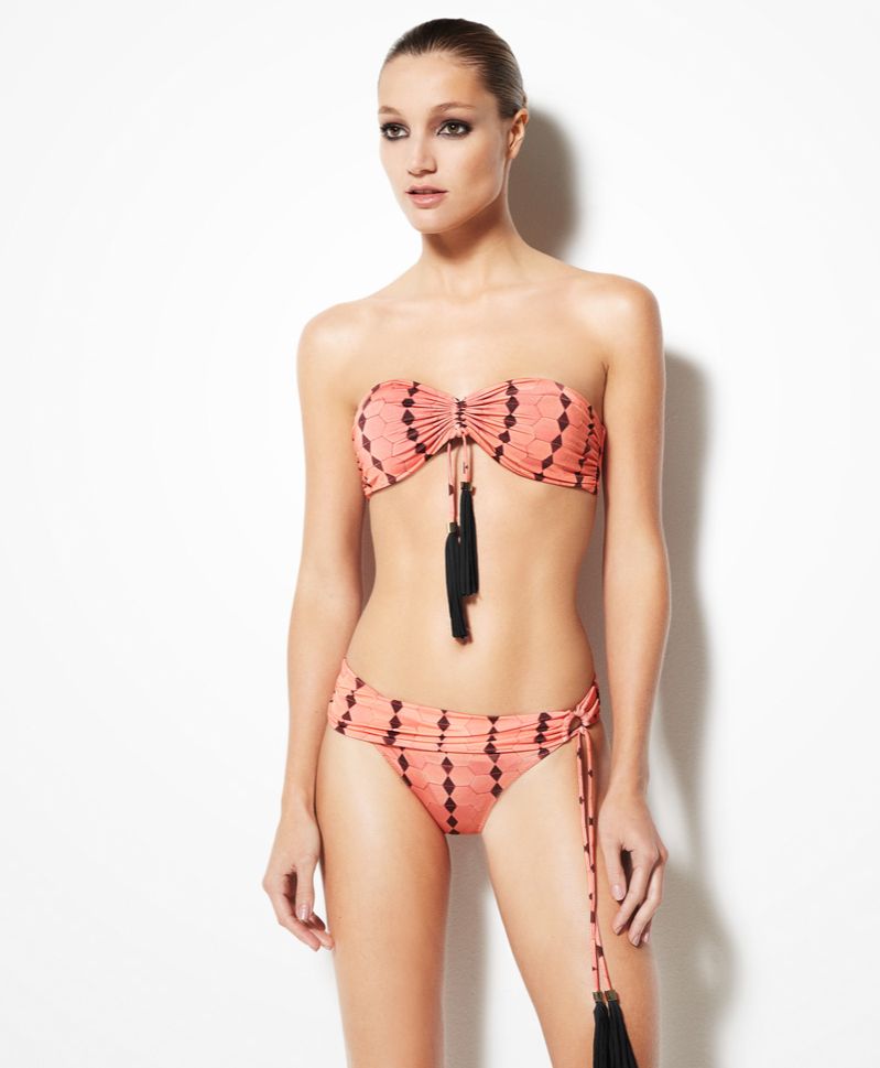 Бански от две части с изключително закачлив аксесоар – и горната, и долната част са украсени с дълги връзки с писклюли накрая. Закачлив, но едновремнно елегантен модел.